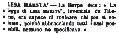 | Lesa maestà - La Harpe dice: «La legge di lesa maestà, inventata da Tiberio, era capace di rovinare chi più si volesse, poiché abbracciando tutti i casi possibili, nessuno ne specificava» [immagine] |
