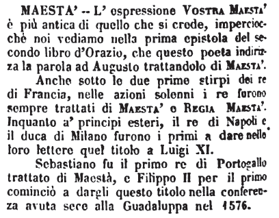 | Maestà - L'espressione Vostra Maestà è più antica di quello che si crede, imperciocchè noi vediamo nella prima epistola del secondo libro d'Orazio, che questo poeta indirizza la parola ad Augusto trattandolo di Maestà.