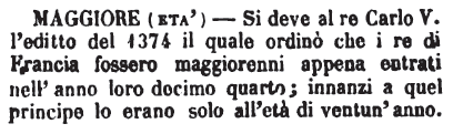 | Maggiore (Età) - Si deve al re Carlo V. l'editto del 1374 il quale ordinò che i re di Francia fossero maggiorenni appena entrati nell'anno loro decimo quarto; innanzi a quel principe lo erano solo all'età di ventun'anno. [immagine] |