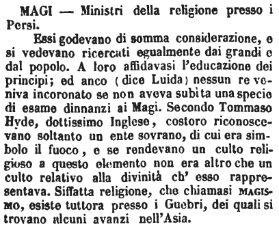 Essi godevano di somma considerazione, e si vedevano ricercati egualmente dai grandi e dal popolo. A loro affidavasi l'educazione dei principi; ed anco (dice Luida) nessun re veniva incoronato se non aveva subìta una specie di esame dinnanzi ai Magi. Secondo Tommaso Hyde, dottissimo Inglese, costoro riconoscevano soltanto un ente sovrano, di cui era simbolo il fuoco, e se rendevano un culto religioso a questo elemento non era altro che un culto relativo alla divinità ch'esso rappresentava. Siffatta religione, che chiamasi magismo, esiste tuttora presso i Guebri, dei quali si trovano alcuni avanzi nell'Asia. [immagine] |