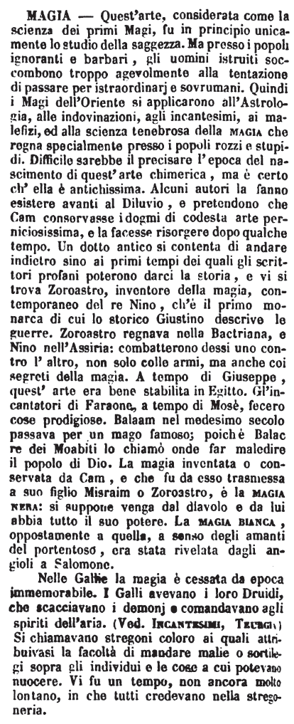 | Magia - Quest'arte, considerata come la scienza dei primi Magi, fu in principio unicamente lo studio della saggezza. Ma presso i popoli ignoranti e barbari, gli uomini istruiti soccombono troppo agevolmente alla tentazione di passare per istraordinarj e sovrumani. Quindi i Magi dell'Oriente si applicarono all'Astrologia, alle indovinazioni, agli incantesimi, ai malefizi, ed alla scienza tenebrosa della magia che regna specialmente presso i popoli rozzi e stupidi. Difficile sarebbe il precisare l'epoca del nascimento di quest'arte chimerica, ma è certo ch'ella è antichissima. Alcuni autori la fanno esistere avanti al Diluvio, e pretendono che Cam conservasse i dogmi di codesta arte perniciosissima, e la facesse risorgere dopo qualche tempo. Un dotto antico si contenta di andare indietro sino ai primi tempi dei quali gli scrittori profani poterono darci la storia, e vi si trova Zoroastro, inventore della magia, contemporaneo del re Nino, ch'è il primo monarca di cui lo storico Giustino descrive le guerre. Zoroastro regnava nella Bactriana, e Nino nell'Assiria: combatterono dessi uno contro l'altro, non solo colle armi, ma anche coi segreti della magia. A tempo di Giuseppe, quest'arte era bene stabilita in Egitto. Gl'incantatori di Faraone, a tempo di Mosè, fecero cose prodigiose. Balaam nel medesimo secolo passava per un mago famoso; poichè Balac re dei Moabiti lo chiamò onde far maledire il popolo di Dio. La magia inventata o conservata da Cam, e che fu da esso trasmessa a suo figlio Misraim o Zoroastro, è la magia nera: si suppone venga dal diavolo e da lui abbia tutto il suo potere. La magia bianca, oppostamente a quella, a senso degli amanti del portentoso, era stata rivelata dagli angioli a Salomone.