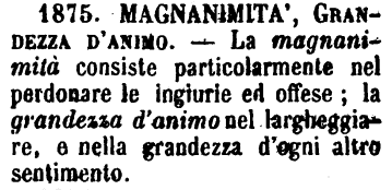 | Magnanimità, Grandezza d’animo - La magnanimità consiste particolarmente nel perdonare le ingiurie ed offese; la grandezza d'animo nel largheggiare, e nella grandezza d'ogni altro sentimento. [immagine] |