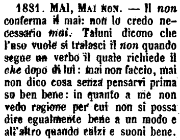 | Mai, Mai non - Il non conferma il mai: non lo credo necessario mai. Taluni dicono che l'uso vuole si tralasci il non quando segue un verbo il quale richiede il che dopo di lui: mai non faccio, mai non dico cosa senza pensarvi prima su ben bene: in quanto a me non vedo ragione per cui non si possa dire egualmente bene a un modo e all'altro quando calzi e suoni bene. [immagine] |