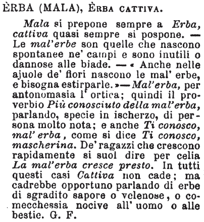 | Erba (mala), Erba cattiva - Mala si prepone sempre a Erba, cattiva quasi sempre si pospone. - Le mal'erbe son quelle che nascono spontanee ne' campi e sono inutili o dannose alle biade. - «Anche nelle ajuole de' fiori nascono le mal'erbe, e bisogna estirparle.» - Mal'erba, per antonomasia l'ortica; quindi il proverbio Più conosciuto della mal'erba, parlando, specie in ischerzo, di persona molto nota; e anche Ti conosco, mal'erba, come si dice Ti conosco, mascherina. De' ragazzi che crescono rapidamente si suol dire per celia La mal'erba cresce presto. In tutti questi casi Cattiva non cade; ma cadrebbe opportuno parlando di erbe di sgradito sapore o velenose, o comecchessia nocive all'uomo o alle bestie. G. F. [immagine] |