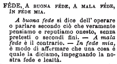| Fede, A buona fede, A mala fede, In fede mia - A buona fede si dice dell'operare o parlare secondo ciò che veramente pensiamo e reputiamo onesto, senza pretesti o secondi fini. A mala fede è il contrario. In fede mia, è modo di affermare che una cosa è quale la diciamo, impegnando la nostra fede e lealtà. [immagine] |