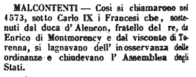 | Malcontenti - Cosi si chiamarono nel 1573, sotto carlo IX i Francesi che, sostenuti dal duca d'Alencon, fratello del re, da Enrico Di Montmorency e dal visconte di Turenna, si lagnavano dell'inosservanza delle ordinanze e chiudevano l'assemblea degli Stati. [immagine] |