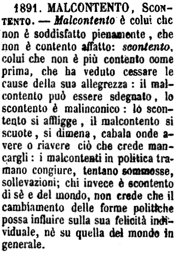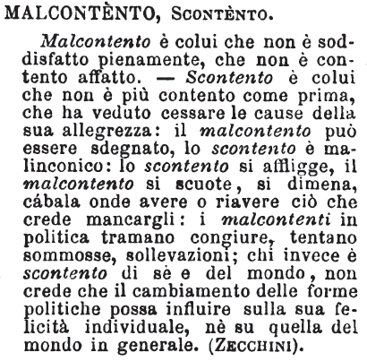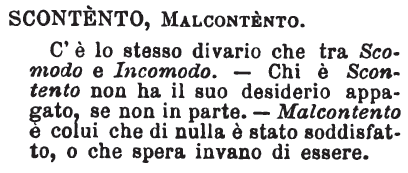| Scontento, Malcontento - C'è lo stesso divario che tra Scomodo e Incomodo. - Chi è Scontento non ha il suo desiderio appagato, se non in parte. - Malcontento è colui che di nulla è stato soddisfatto, o che spera invano di essere. [immagine] |