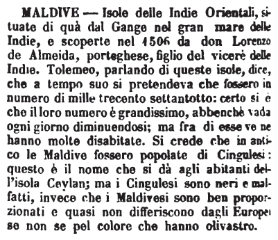 | Maldive - Isole delle Indie Orientali, situate di quà dal Gange nel gran mare delle Indie, e scoperte nel 1506 da don Lorenzo de Almeida, portoghese, figlio del vicerè delle Indie. Tolemeo, parlando di queste isole, dice, che a tempo suo si pretendeva che fossero in numero di mille trecento settantotto: certo si è che il loro numero è grandissimo, abbenchè vada ogni giorno diminuendosi; ma fra di esse ve ne hanno molte disabitate. Si crede che in antico le Maldive fossero popolate di Cingulesi: questo è il nome che si dà agli abitanti dell'isola Ceylan; ma i Cingulesi sono neri e malfatti, invece che i Maldivesi sono ben proporzionati e quasi non differiscono dagli Europei se non se pel colore che hanno olivastro. [immagine] |
