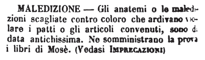 | Maledizione - Gli anatemi o le maledizioni scagliate contro coloro che ardivano violare i patti o gli articoli convenuti, sono di data antichissima. Ne somministrano la prova i libri di Mosè. (Vedasi Imprecazioni) [immagine] |