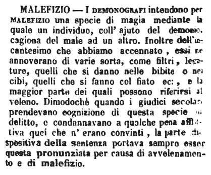 | Malefizio - I demonografi intendono per malefizio una specie di magia mediante la quale un individuo, coll'ajuto del demonio, cagiona del male ad un altro. Inoltre dell'incantesimo che abbiamo accennato, essi ne annoverano di varie sorta, come filtri, legature, quelli che si danno nelle bibite o nei cibi, quelli che si fanno col fiato ec:, e la maggior parte dei quali possono riferirsi al veleno. Dimodochè quando i giudici secolari prendevano cognizione di questa specie di delitto, e condannavano a qualche pena afflittiva quei che n'erano convinti, la parte dispositiva della sentenza portava sempre esser questa pronunziata per causa di avvelenamento e di malefizio. [immagine] |