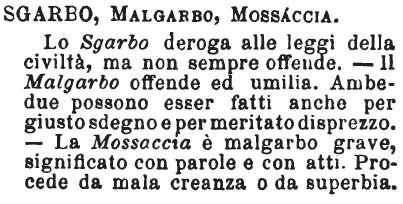| Sgarbo, Malgarbo, Mossaccia - Lo Sgarbo deroga alle leggi della civiltà, ma non sempre offende. - Il Malgarbo offende ed umilia. Ambedue possono esser fatti anche per giusto sdegno e per meritato disprezzo. - La Mossaccia è malgarbo grave, significato con parole e con atti. Procede da mala creanza o da superbia. [immagine] |