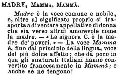 Madre, Mamma, Mammà - Madre è la voce comune e nobile, e, oltre al significato proprio si trasporta a diventare appellativo di donna che sia verso altrui amorevole come la madre. - «La signora C. è la madre de' poveri.» - La voce Mamma è, fino dal principio della lingua, voce del più dolce affetto; che da poco in qua gli snaturati Italiani hanno convertito francesamente in Mammà; e anche se ne tengono! [immagine]