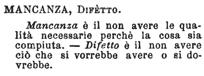 | Mancanza, Difetto - Mancanza è il non avere le qualità necessarie perchè la cosa sia compiuta.