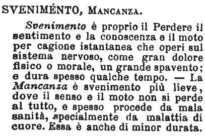 | Svenimento, Mancanza - Svenimento è proprio il Perdere il sentimento e la conoscenza e il moto per cagione istantanea che operi sul sistema nervoso, come gran dolore fisico o morale, un grande spavento; e dura spesso qualche tempo. - La Mancanza è svenimento più lieve, dove il senso e il moto non si perde al tutto, e spesso procede da mala sanità, specialmente da malattia di cuore. Essa è anche di minor durata. [immagine] |