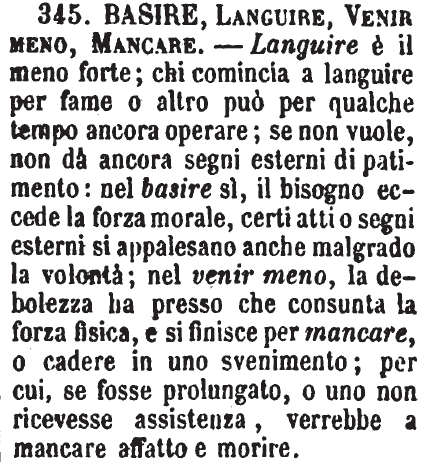 | Basire, Languire, Venir meno, Mancare - Languire è il meno forte; chi comincia a languire per fame o altro può per qualche tempo ancora operare; se non vuole, non dà ancora segni esterni di patimento: nel basire sì, il bisogno eccede la forza morale, certi atti o segni esterni si appalesano anche malgrado la volontà; nel venir meno, la debolezza ha presso che consunta la forza fisica, e si finisce per mancare, o cadere in uno svenimento; per cui, se fosse prolungato, o uno non ricevesse assistenza, verrebbe a mancare affatto e morire. [immagine] |