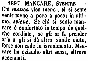 | Mancare, Svenire - Chi manca vien meno; ei si sente venir meno a poco a poco; in ultimo, sviene. Se chi si sente mancare è confortato in tempo da qualche cordiale, se gli si fa prender aria o gli si dà altro simil aiuto, forse non cade in isvenimento. Mancare ha eziandio altri sensi, altrove accennati. [immagine] |