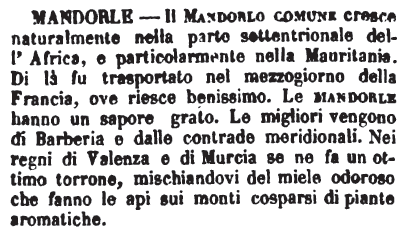 | Mandorle - Il Mandorlo comune cresce naturalmente nella parte settentrionale dell'Africa, e particolarmente nella Mauritania. Di là fu trasportato nel mezzogiorno della Francia, ove riesce benissimo. Le mandorle hanno un sapore grato. Le migliori vengono di Barberia e dalle contrade meridionali. Nei regni di Valenza e di Murcia se ne fu un ottimo torrone, mischiandovi del miele odoroso che fanno le api sui monti cosparsi di piante aromatiche. [immagine] |