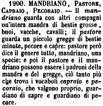 | Mandriano, Pastore, Capraio, Pecoraio - Il mandriano guarda con altri compagni un'intera mandra di bestie grosse, buoi, vacche, cavalli; il pastore guarda un piccolo gregge di bestie minute, pecore e capre: pastore però dice il genere tutto, mandriano, una specie: e poi il pastore e il mandriano possono essere i padroni della mandra e del gregge, ciò tanto più che trovo i vocaboli capraio e pecoraio, che valgono proprio, guardiano di capre e guardiano di pecore. [immagine] |
