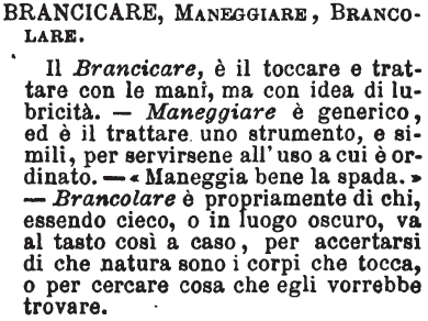 | Brancicare, Maneggiare, Brancolare - Il Brancicare, è il toccare e trattare con le mani, ma con idea di lubricità. - Maneggiare è generico, ed è il trattare uno strumento, e simili, per servirsene all'uso a cui è ordinato. -«Maneggia bene la spada.» - Brancolare è propriamente di chi, essendo cieco, o in luogo oscuro, va al tasto così a caso, per accertarsi di che natura sono i corpi che tocca, o per cercare cosa che egli vorrebbe trovare. [immagine] |