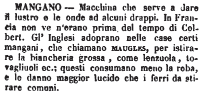 | Mangano - Macchina che serve a dare il lustro e le onde ad alcuni drappi. In Francia non ve n'erano prima del tempo di Colbert. Gl'Inglesi adoprano nelle case certi mangani, che chiamano maugles, per istirare la biancheria grossa, come lenzuola, tovagliuoli ec; questi consumano meno la roba, e le danno maggior lucido che i ferri da stiro comuni. [immagine] |