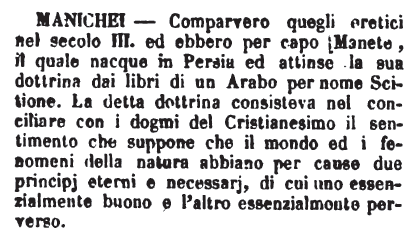 | Manichei - Comparvero queli eretici nel secolo III. ed ebbero per capo Manete, il quale nacque in Persia ed attinse la sua dottrina dai libri di un Arabo per nome Scitione. La detta dottrina consisteva nel conciliare con i dogmi del Cristianesimo il sentimento che suppone che il mondo ed i fenomeni della natura abbiano per cause due principj eterni e necessarj, di cui uno essenzialmente buono e l'altro essenzialmente perverso. [immagine] |