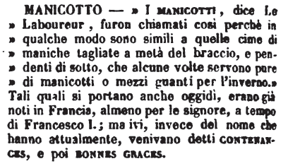 | Manicotto - «I manicotti, dice Le Laboureur, furon chiamati così perché in qualche modo sono simili a quelle cime di maniche tagliate a metà del braccio, e pendenti di sotto, che alcune volte servono pure di manicotti o mezzi guanti per l'inverno.» Tali quali si portano anche oggidì, erano già noti in Francia, almeno per le signore, a tempo di Francesco I.; ma ivi, invece del nome che hanno attualmente, venivano detti contenances, e poi bonnes graces. [immagine] |