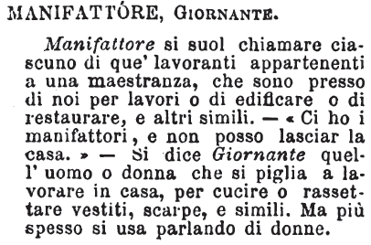 | Manifattore, Giornante - Manifattore si suol chiamare ciascuno di que' lavoranti appartenenti a una maestranza, che sono presso di noi per lavori o di edificare o di restaurare, e altri simili. - «Ci ho i manifattori, e non posso lasciar la casa.» - Si dice Giornante quell'uomo o donna che si piglia a lavorare in casa, per cucire o rassettare vestiti, scarpe, e simili. Ma più spesso si usa parlando di donne. [immagine] |