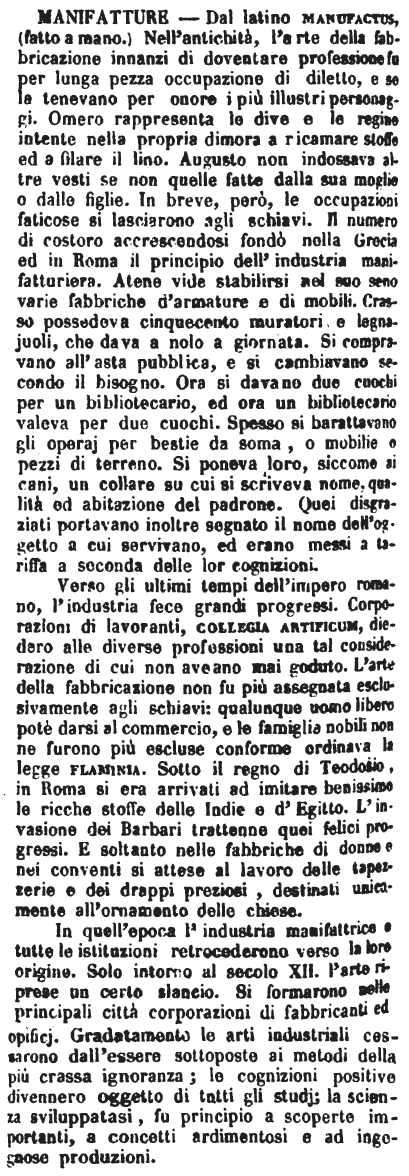| Manifatture - Dal latino manufactus, (fatto a mano.) Nell'antichità, l'arte della fabbricazione innanzi di doventare professione fu per lunga pezza occupazione di diletto, e se la tenevano per onore i più illustri personaggi. Omero rappresenta le dive e le regine intente nella propria dimora a ricamare stoffe ed a filare il lino. Augusto non indossava altre vesti se non quelle fatte dalla sua moglie o dalle figlie. In breve, però, le occupazioni faticose si lasciarono agli schiavi. Il numero di costoro accrescendosi fondò nella Grecia ed in Roma il principio dell'industria manifatturiera. Atene vide stabilirsi nel suo seno varie fabbriche d'armature e di mobili. Crasso possedeva cinquecento muratori e legnajuoli, che dava a nolo a giornata. Si compravano all'asta pubblica, e si cambiavano secondo il bisogno. Ora si davano due cuochi per un bibliotecario, ed ora un bibliotecario valeva per due cuochi. Spesso si barattavano gli operaj per bestie da soma, o mobilie o pezzi di terreno. Si poneva loro, siccome ai cani, un collare su cui si scriveva nome, qualità ed abitazione del padrone. Quei disgraziati portavano inoltre segnato il nome dell'oggetto a cui servivano, ed erano messi a tariffa a seconda delle lor cognizioni.