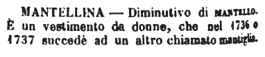 | Mantellina - Diminutivo di mantello. È un vestimento da donne, che nel 1736 o 1737 succedè ad un altro chiamato mantiglia. [immagine] |