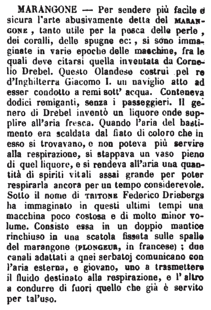 | Marangone - Per rendere più facile e sicura l'arte abusivamente detta del marangone, tanto utile per la pesca delle perle, dei coralli, delle spugne, ec:, si sono immaginate in varie epoche delle macchine, fra le quali deve citarsi quella inventata da Cornelio Drebel. Questo Olandese costruì pel re d'Inghilterra Giacomo I. un naviglio atto ad esser condotto a remi sott'acqua. Conteneva dodici remiganti, senza i passeggieri. Il genero di Drebel inventò un liquore onde supplire all'aria fresca. Quando l'aria del bastimento era scaldata dal fiato di coloro che in esso si trovavano, e non poteva più servire alla respirazione, si stappava un vaso pieno di quel liquore, e si rendeva all'aria una quantità di spiriti vitali assai grande per poter respirarla ancora per un tempo considerevole. Sotto il nome di tritone Federico Driebergs ha immaginato in questi ultimi tempi una macchina poco costosa e di molto minor volume. Consiste essa in un doppio mantice rinchiuso in una scatola fissata sulle spalle del marangone (plongeur, in francese); due canali adattati a quei serbatoj comunicano con l'aria esterna, e giovano, uno a trasmettere il fluido destinato alla respirazione, e l'altro a condurre di fuori quello che già è servito per tal'uso. [immagine] |