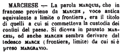 | Marchese - La parola marquis, che in francese proviene da marche, voce antica equivalente a limite o frontiera, era il titolo di quelli a cui si commetteva la custodia dei confini del paese. Si diceva in passato marchis, ed anche marche sembra derivare dal tedesco marck (frontiera, limite) da cui si è preso margravio. [immagine] |