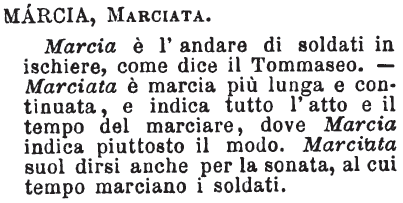 | Marcia, Marciata - Marcia è l'andare di soldati in ischiere, come dice il Tommaseo. Marciata è marcia più lunga e continuata, e indica tutto l'atto e il tempo del marciare, dove Marcia indica piuttosto il modo. Marciata suol dirsi anche per la sonata, al cui tempo marciano i soldati. [immagine] |