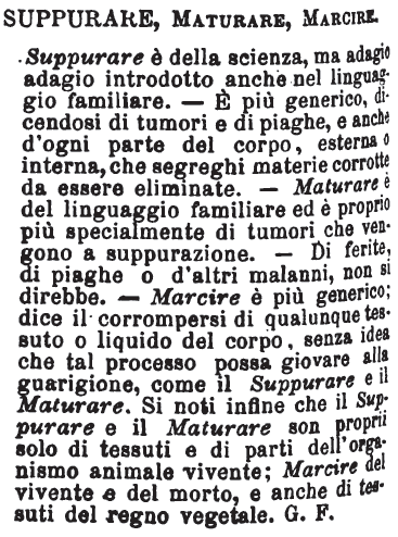 | Suppurare, Maturare, Marcire - Suppurare è della scienza, ma adagio adagio introdotto anche nel linguaggio familiare. — E' più generico, dicendosi di tumori e di piaghe, e anche d'ogni parte del corpo, esterna o interna, che segreghi materie corrotte da essere eliminate. — Maturare è del linguaggio familiare ed è proprio più specialmente di tumori che vengono a suppurazione. — Di ferite, di piaghe o d'altri malanni, non si direbbe. — Marcire è più generico; dice il corrompersi di qualunque tessuto o liquido del corpo, senza idea che tal processo possa giovare alla guarigione, come il Suppurare e il Maturare. Si noti infine che il Suppurare e il Maturare son proprii solo di tessuti e di parti dell'organismo animale vivente; Marcire del vivente e del morto, e anche di tessuti del regno vegetale. G. F. [immagine] |