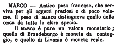 | Marco - Antico peso francese, che serviva per gli oggetti preziosi o di poco volume. Il peso di marco distingueva quello delle once da tutte le altre specie.
