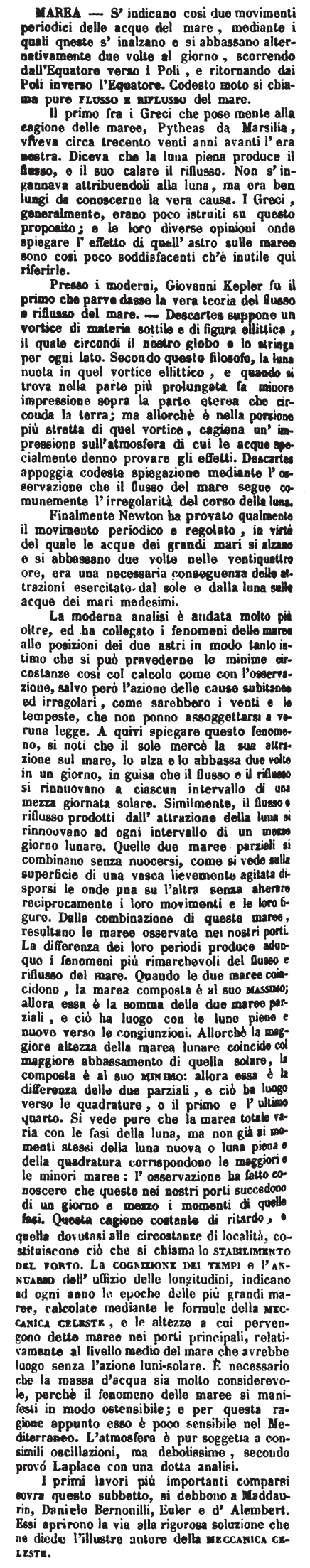 | Marea - S'indicano così due movimenti periodici delle acque del mare, mediante i quali queste s'inalzano e si abbassano alternativamente due volte al giorno, scorrendo dall'Equatore verso i Poli, e ritornando dai Poli inverso l'Equatore. Codesto moto si chiama pure flusso e riflusso del mare.
