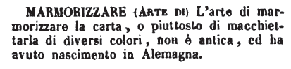 | Marmorizzare (Arte di) - L'arte di marmorizzare la carta, o piuttosto di macchiettarla di diversi colori, non è antica, ed ha avuto nascimento in Alemagna. [immagine] |