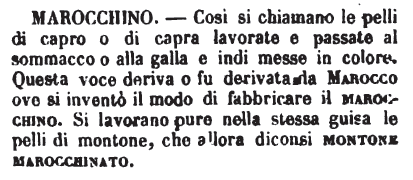 | Marocchino - Così si chiamano le pelli di capro o di capra lavorate e passate al sommacco o alla galla e indi messe in colore. Questa voce deriva o fu derivata da Marocco ove si inventò il modo di fabbricare il marocchino. Si lavorano pure nella stessa guisa le pelli di montone, che allora diconsi montone marocchinato. [immagine] |