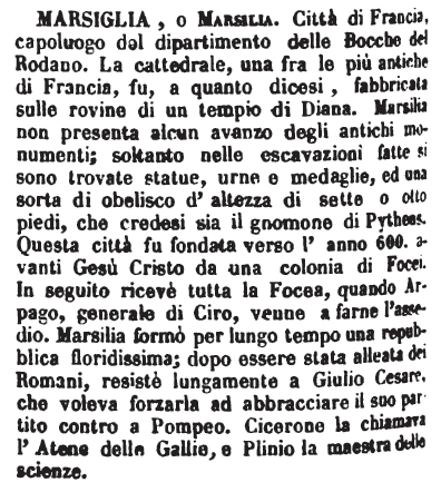 | Marsiglia, o Marsilia - Città di Francia, capoluogo del dipartimento delle Bocche del Rodano. La cattedrale, una fra le più antiche di Francia, fu, a quanto dicesi, fabbricata sulle rovine di un tempio di Diana. Marsilia non presenta alcun avanzo degli antichi monumenti; soltanto nelle escavazioni fatte si sono trovate statue, urne e medaglie, ed una sorta di obelisco d'altezza di sette o otto piedi, che credesi sia il gnomone di Pytheos. Questa città fu fondata verso l'anno 600. avanti Gesù Cristo da una colonia di Focei. In seguito ricevè tutta la Focea, quando Arpago, generale di Ciro, venne a farne l'assedio. Marsilia formò per lungo tempo una repubblica floridissima; dopo essere stata alleata dei Romani, resistè lungamente a Giulio Cesare, che voleva forzarla ad abbracciare il suo partito contro a Pompeo. Cicerone la chiamava l'Atene delle Gallie, e Plinio la maestra delle scienze. [immagine] |
