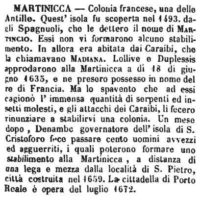 | Martinicca - Colonia francese, una delle Antille. Quest'isola fu scoperta nel 1493. dagli Spagnuoli, che le dettero il nome di Martincio. Essi non vi formarono alcuno stabilimento. In allora era abitata dai Caraibi, che la chiamavano Madiana. Lollive e Duplessis approdarono alla Martinicca a dì 18 di giugno 1635, e ne presero possesso in nome del re di Francia. Ma lo spavento che ad essi cagionò l'immensa quantità di serpenti ed insetti molesti, e gli attacchi dei Caraibi, li fecero rinunziare a stabilirvi una colonia. Un mese dopo, Denambe governatore dell'isola di S. Cristoforo fece passare cento uomini avvezzi ed agguerriti, i quali poterono formare uno stabilimento alla Martinicca, a distanza di una lega e mezza dalla località di S. Pietro, città costruita nel 1659. La cittadella di Porto Reale è opera del luglio 1672. [immagine] |