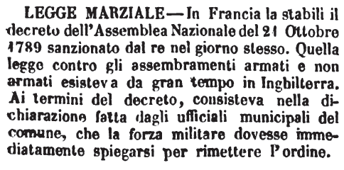 | Legge marziale - In Francia la stabilì il decreto dell'Assemblea Nazionale del 21 Ottobre 1789 sanzionato dal re nel giorno stesso. Quella legge contro gli assembramenti armati e non armati esisteva da gran tempo in Inghilterra. Ai termini del decreto, consisteva nella dichiarazione fatta dagli ufficiali municipali del comune, che la forza militare dovesse immediatamente spiegarsi per rimettere l'ordine. [immagine] |