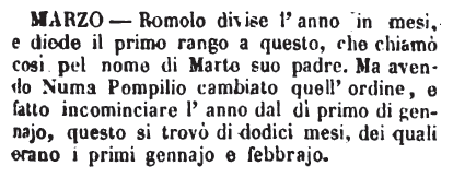 | Marzo - Romolo divise l'anno in mesi, e diede il primo rango a questo, che chiamò così pel nome di Marte suo padre. Ma avendo Numa Pompilio cambiato quell'ordine, e fatto incominciare l'anno dal dì primo di gennajo, questo si trovò di dodici mesi, dei quali erano i primi gennajo e febbrajo. [immagine] |