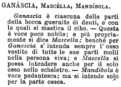 | Ganascia, Mascella, Mandibola - Ganascia è ciascuna delle parti della bocca guernite di denti, e con le quali si mastica il cibo. - Questa è voce poco nobile; e più propriamente si dice Mascella; benchè per Ganascia s'intenda sempre l'osso vestito di tutte le sue parti molli nella persona viva; e Mascella si possa intendere anche per il solo osso nello scheletro. - Mandibola è voce pedantesca; ma si intende solo per la parte ossea. [immagine] |