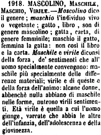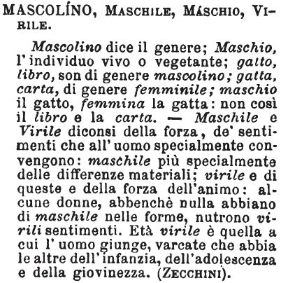| Mascolino, Maschile, Maschio, Virile - Mascolino dice il genere; Maschio, l'individuo vivo o vegetante; gatto, libro, son di genere mascolino; gatta, carta, di genere femminile; maschio il gatto, femmina la gatta: non così il libro e la carta. - Maschile e Virile diconsi della forza, de' sentimenti che all'uomo specialmente convengono: maschile più specialmente delle differenze materiali; virile e di queste e della forza dell'animo: alcune donne, abbenchè nulla abbiano di maschile nelle forme, nutrono virili sentimenti. Età virile è quella a cui l'uomo giunge, varcate che abbia le altre dell'infanzia, dell'adolescenza e della giovinezza. (Zecchini). [immagine] |