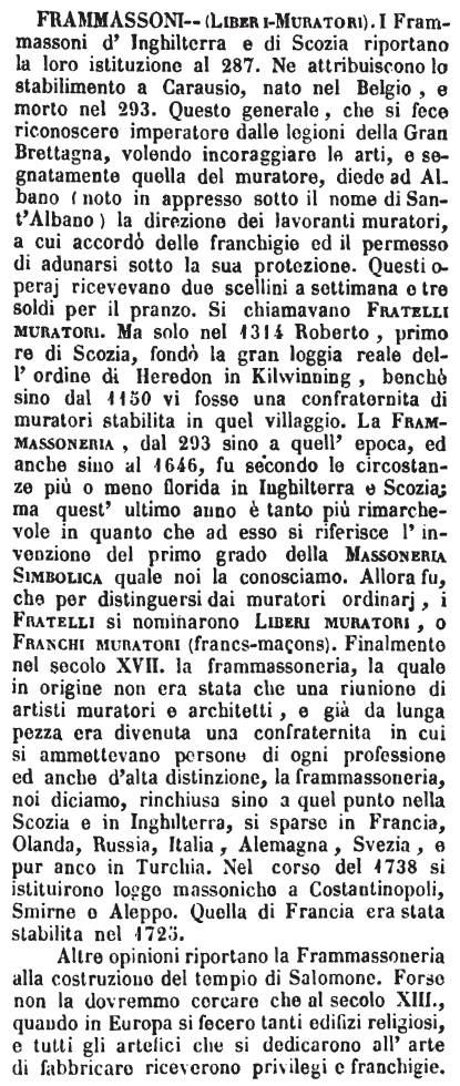 | Frammassoni (Liberi-Muratori) - I Frammassoni d'Inghilterra e di Scozia riportano la loro istituzione al 287. Ne attribuiscono lo stabilimento a Carausio, nato nel Belgio, e morto nel 293. Questo generale, che si fece riconoscere imperatore dalle legioni della Gran Brettagna, volendo incoraggiare le arti, e segnatamente quella del muratore, diede ad Albano (noto in appresso sotto il nome di Sant'Albano) la direzione dei lavoranti muratori, a cui accordò delle franchigie ed il permesso di adunarsi sotto la sua protezione. Questi operaj ricevevano due scellini a settimana e tre soldi per il pranzo. Si chiamavano Fratelli muratori. Ma solo nel 1314 Roberto, primo re di Scozia, fondò la gran loggia reale dell'ordine di Heredon in Kilwinning, benché sino dal 1150 vi fosse una confraternita di muratori stabilita in quel villaggio. La Frammassoneria, dal 293 sino a quell'epoca, ed anche sino al 1646, fu secondo le circostanze più o meno florida in Inghilterra e Scozia; ma quest'ultimo anno è tanto più rimarchevole in quanto che ad esso si riferisce l'invenzione del primo grado della Massoneria Simbolica quale noi la conosciamo. Allora fu, che per distinguersi dai muratori ordinarj, i Fratelli si nominarono Liberi muratori, o Franchi muratori (francs-macons). Finalmente nel secolo XVII. la frammassoneria, la quale in origine non era stata che una riunione di artisti muratori e architetti, e già da lunga pezza era divenuta una confraternita in cui si ammettevano persone di ogni professione ed anche d'alta distinzione, la frammassoneria, noi diciamo, rinchiusa sino a quel punto nella Scozia e in Inghilterra, si sparse in Francia, Olanda, Russia, Italia, Alemagna, Svezia, e pur anco in Turchia. Nel corso del 1738 si istituirono logge massoniche a Costantinopoli, Smirne e Aleppo. Quella di Francia era stata stabilita nel 1725.
