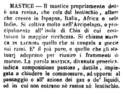 | Mastice - Il mastice propriamente detto è una resina, che cola dal lentischio, albero che cresce in Ispagna, Italia, Africa e nelle Indie. Si coltiva molto nell'Arcipelago, e principalmente all'isola di Chio di cui costituisce la maggior ricchezza. Si chiama mastice in lacrima quello che si congela a goccie sui rami. E' il più puro, e quello che gli statuarj adoprano per riunire i frammenti di marmo. La parola mastice, divenuta generica, indica composizione pastosa, duttile, impiegata a chiudere le commessure, ad opporsi al passaggio o all'azione dei gaz e de' liquidi, ed in cui non entrano nè resina nè lentischio. [immagine] |