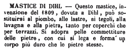 | Mastice di Dihl - Questo mastice, invenzione del 1809, dovuta a Dihl, può sostituirsi al piombo, alle lastre, ai tegoli, alla lavagna e alla pietra, tanto per coperchi che per terrazzi. Si adopra pelle commettiture delle pietre, con cui si lege e forma un corpo più duro che le pietre stesse. [immagine] |