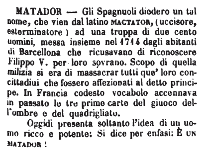 | Matador - Gli Spagnuoli diedero un tal nome, che vien dal latino mactator, (uccisore, esterminatore) ad una truppa di due cento uomini, messa insieme nel 1714 dagli abitanti di Barcellona che ricusavano di riconoscere Filippo V. per loro sovrano. Scopo di quella milizia si era di massacrar tuti que' loro concittadini che fossero affezionati al detto principe. In Francia codesto vocabolo accennava in passato le tre prime carte del giuoco dell'ombre e del quadrigliato.
