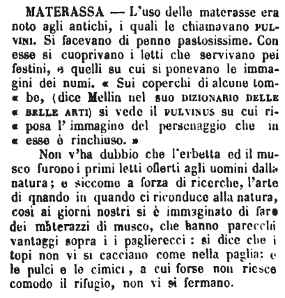 Materassa - L'uso delle materasse era noto agli antichi, i quali le chiamavano pulvini. Si facevano di penne pastosissime. Con esse si cuoprivano i letti che servivano pei festini, e quelli su cui si ponevano le immagini dei numi. «Sui coperchi di alcune tombe, (dice Mellin nel suo dizionario delle belle arti) si vede il pulvinus su cui riposa l'immagine del personaggio che in esse è rinchiuso.»