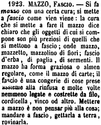 | Mazzo, Fascio - Si fa mazzo con una certa cura; si mette a fascio come vien viene: la cura che si mette a fare il mazzo dice chiaro che gli oggetti di cui si compone son più preziosi di quelli che si mettono a fascio; onde mazzo, mazzetto, mazzolino di fiori; fascio d'erba, di paglia, di sermenti. Il mazzo ha forma graziosa o almen regolare, come il mazzo di carte; il fascio è una congerie di cose prese assieme alla rinfusa e molte volte nemmeno legate e costrette da filo, cordicella, vinco od altro. Mettere a mazzo è non pensar più alla cosa; mandare a fascio, gettarla a terra, rovinarla. [immagine] |