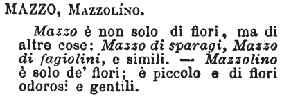 | Mazzo, Mazzolino - Mazzo è non solo di fiori, ma di altre cose: Mazzo di sparagi, Mazzo di fagiolini, e simili. - Mazzolino è solo de' fiori; è piccolo e di fiori odorosi e gentili. [immagine] |
